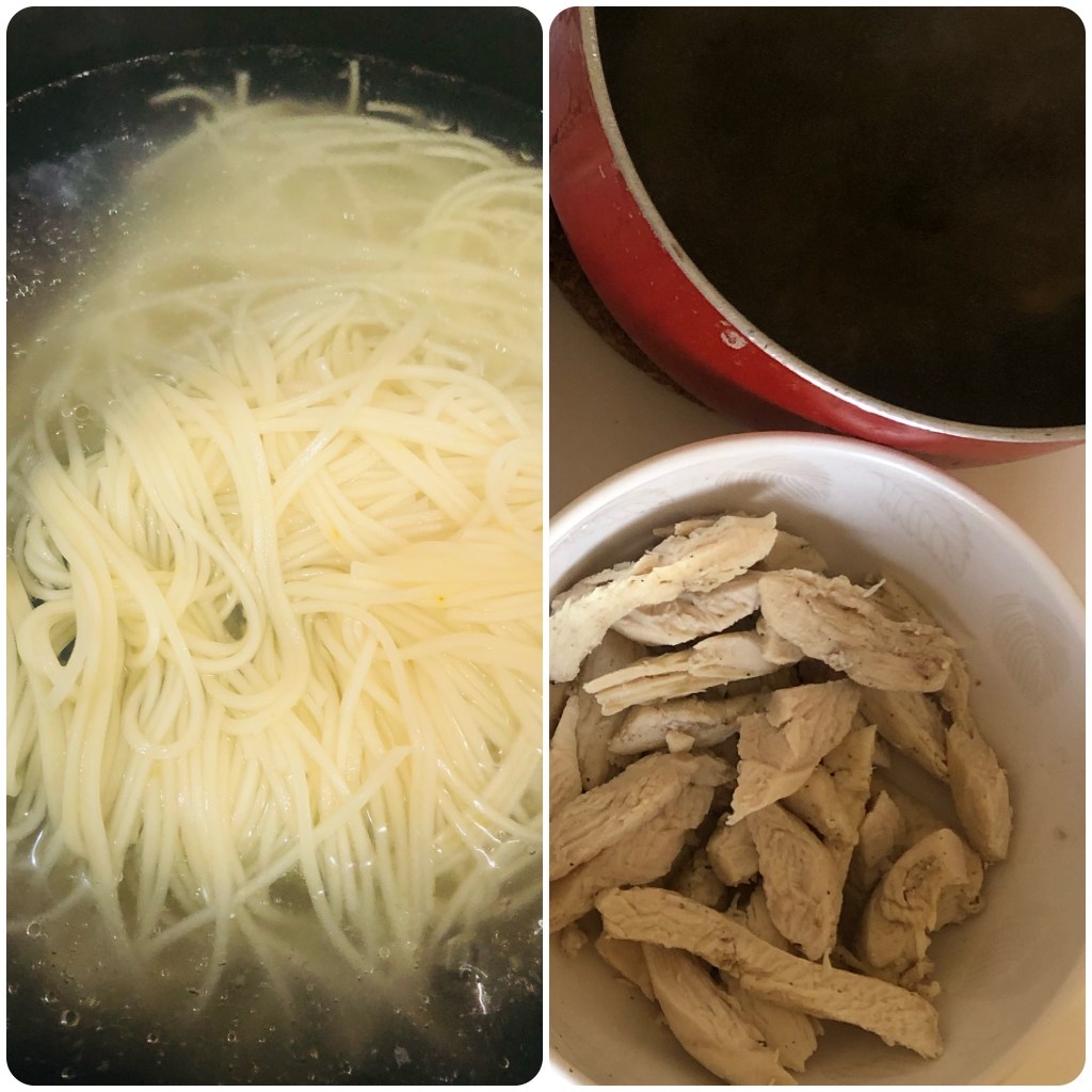 Boil chicken with 3 cups water seasoned with salt, pepper, and few drops of Soya sauce. Once cooked, remove chicken, shred, and keep aside. Reserve broth.
